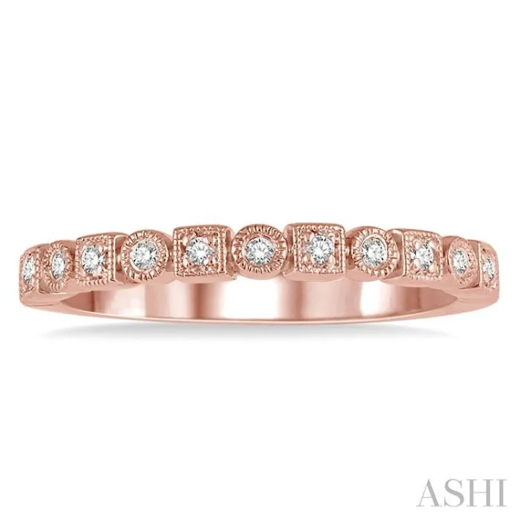 A charming diamond stackable band, this offers a lovely set up of round and square mounts, alternately linked in a neat row. It is so attractively designed that it can be worn solely on its own or as a complementing ring to other stack bands. Each of the 6 round and 7 square mounts is encrusted with a pave set round cut diamond, giving the stack band a spectacular look. Also, a milgrain border is offered to the mounts, adding a highlighting touch to the design. The ring is crafted in 14 karat rose gold. Total diamond weight is 1/10 ctw.