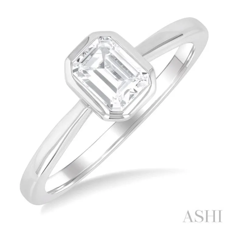 Ideal for an engagement or special occasion, this eye-catching diamond solitaire ring is a beautiful expression of love and commitment. The elegant ring features an emerald cut diamond at its center in a unique pie cut that offers an added brilliance to the diamond, exuding timeless sophistication. A plain gold reverse tapered shank gives prominence to the center stone. Crafted in a rhodium finished 14 karat white gold, this solitaire ring perfectly balances classic style with modern flair. Total diamond weight is 1/4 ctw.