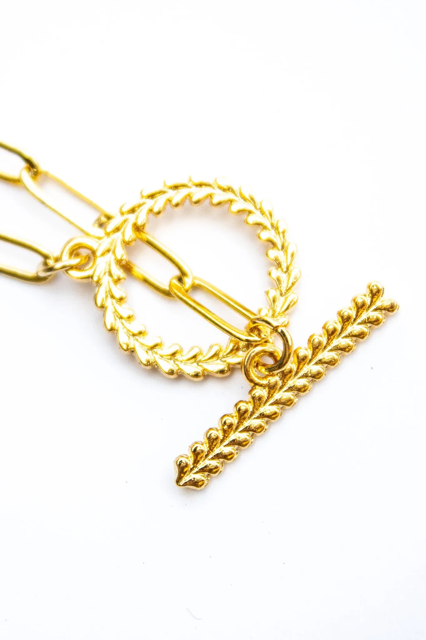 The 18K Link Heart of Fatima Bracelet features a Heart of Fatima charm, known for its protective symbolism. The gold-plated link chain adds a luxurious touch, while the toggle closure ensures a secure fit.