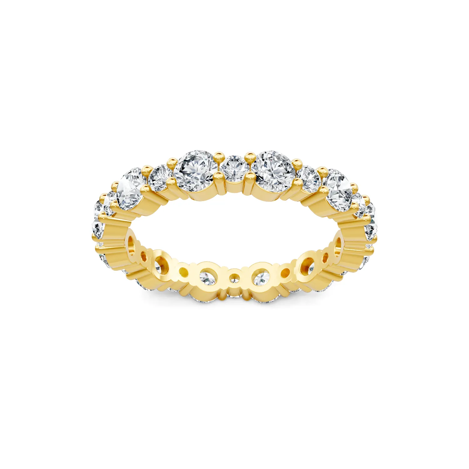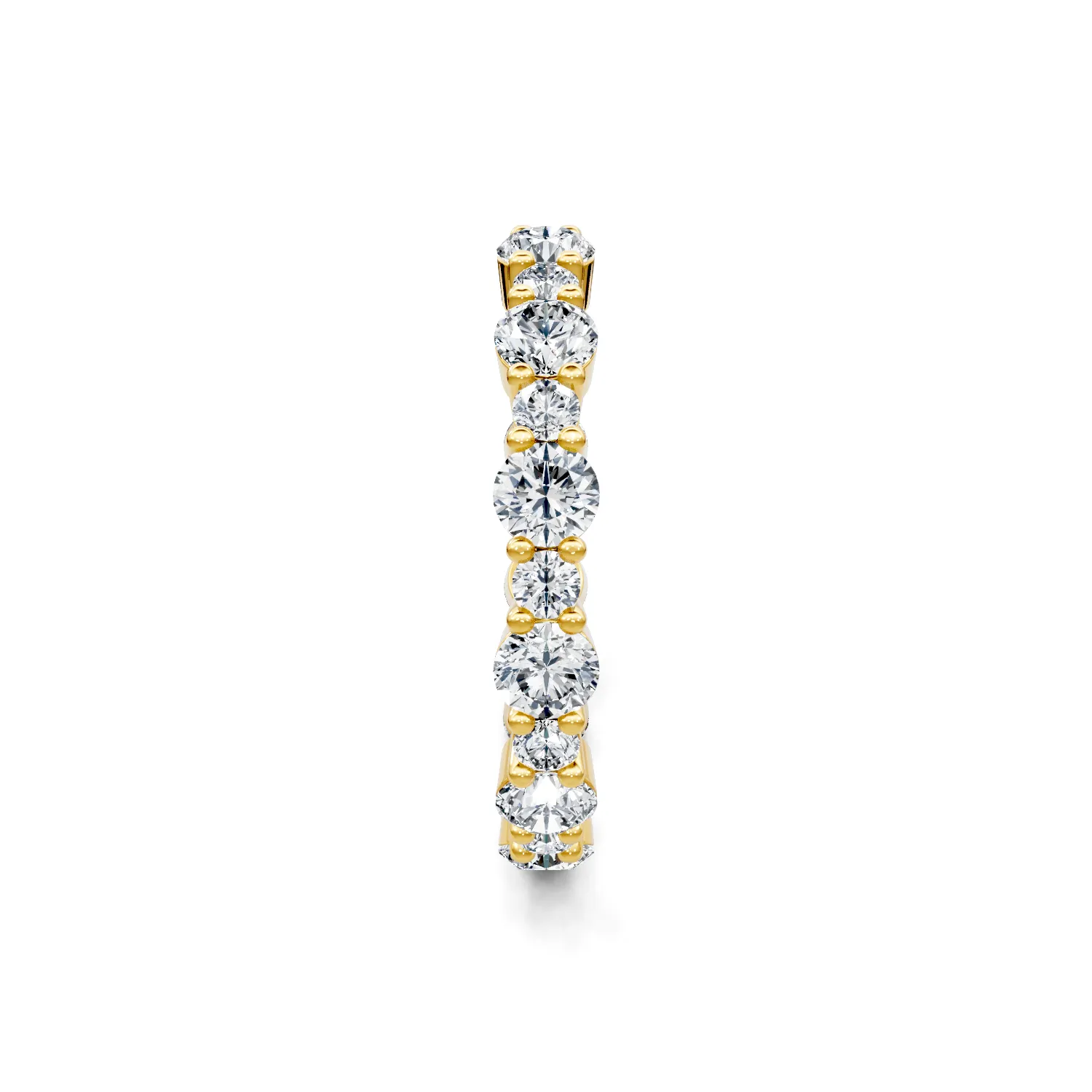 This 18K yellow gold eternity band features 1.8ctw of round diamonds in alternating sizes. Timeless and elegant, this band is the perfect symbol of everlasting love and commitment. All sales are final