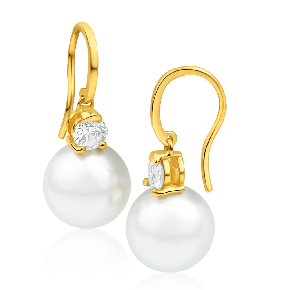 9ct Charming Yellow Gold Simulated Pearl and Cubic Zirconia Drop Earrings