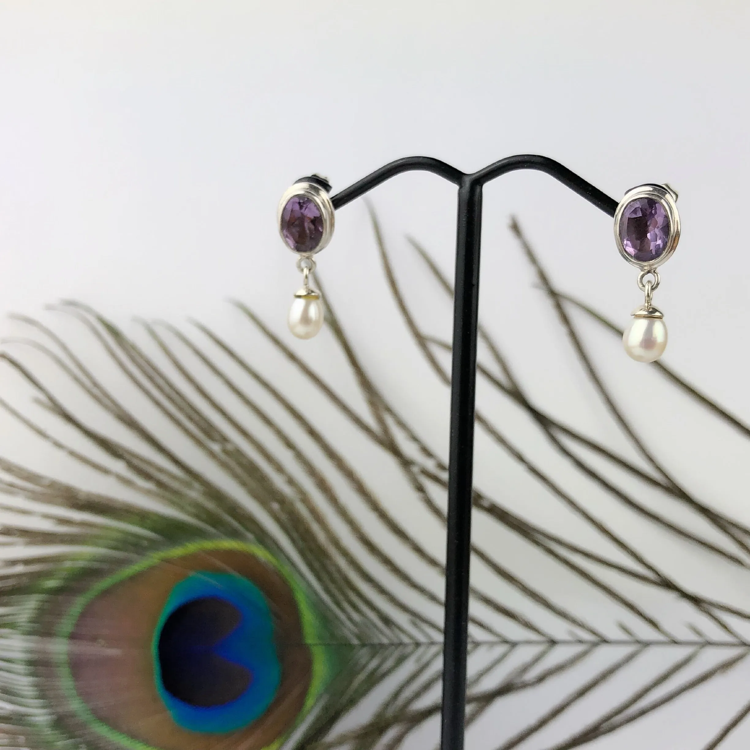 Dazzling Silver set ovals of purple Amethyst hold a dainty drop of soft white Freshwater Pearl to add a feminine yet modern twist on a classic design.