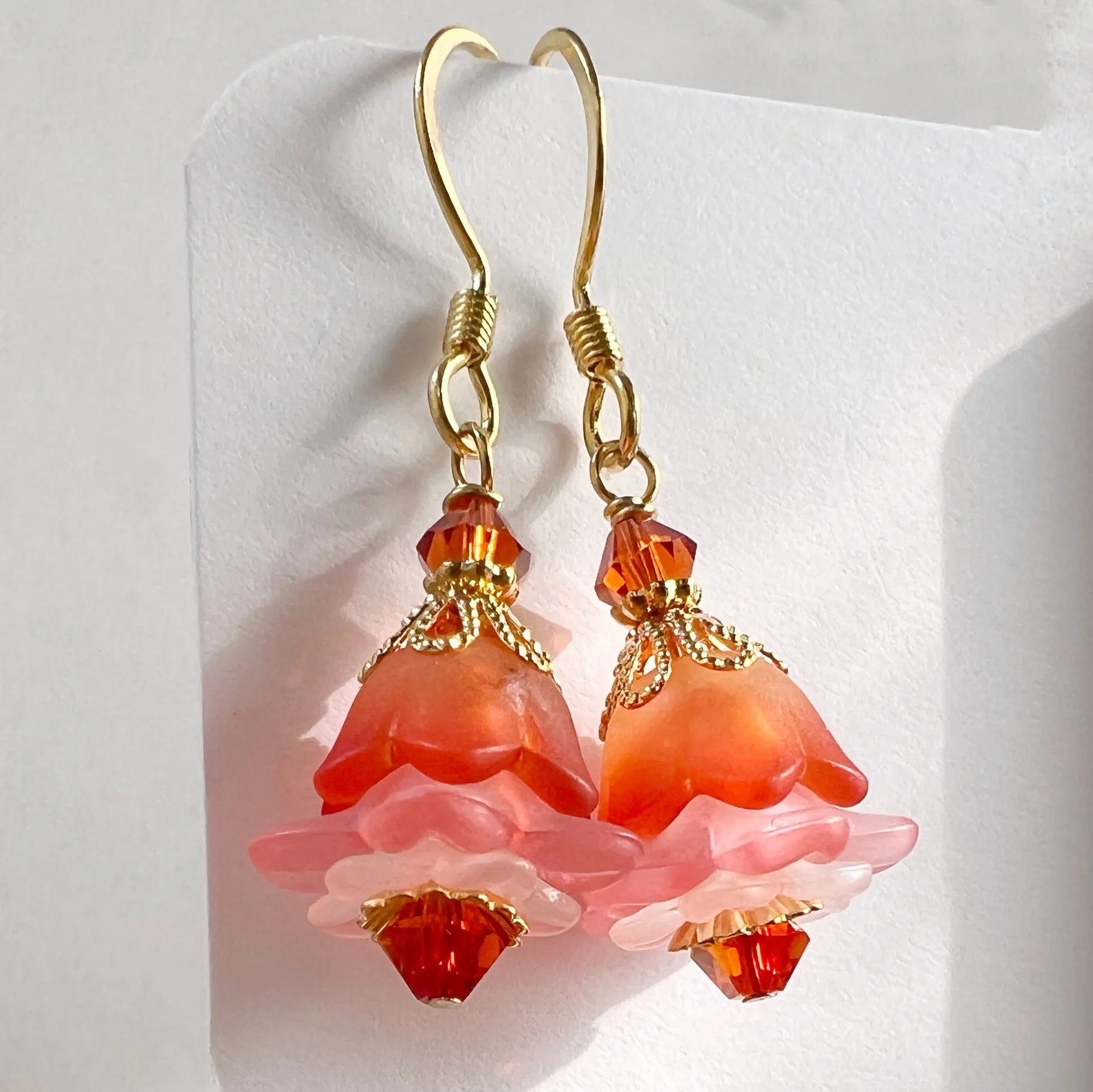 Feminine little flower earrings are made with vintage style lucite and are set between sparkling crystals. These hang plated metal hooks .