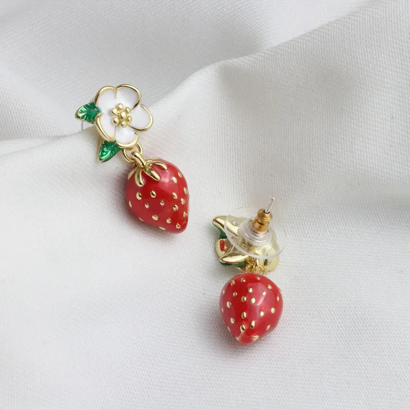 The set features strawberry pendants with a vivid red enamel finish, complemented by delicate white enamel accents for a touch of sophistication.