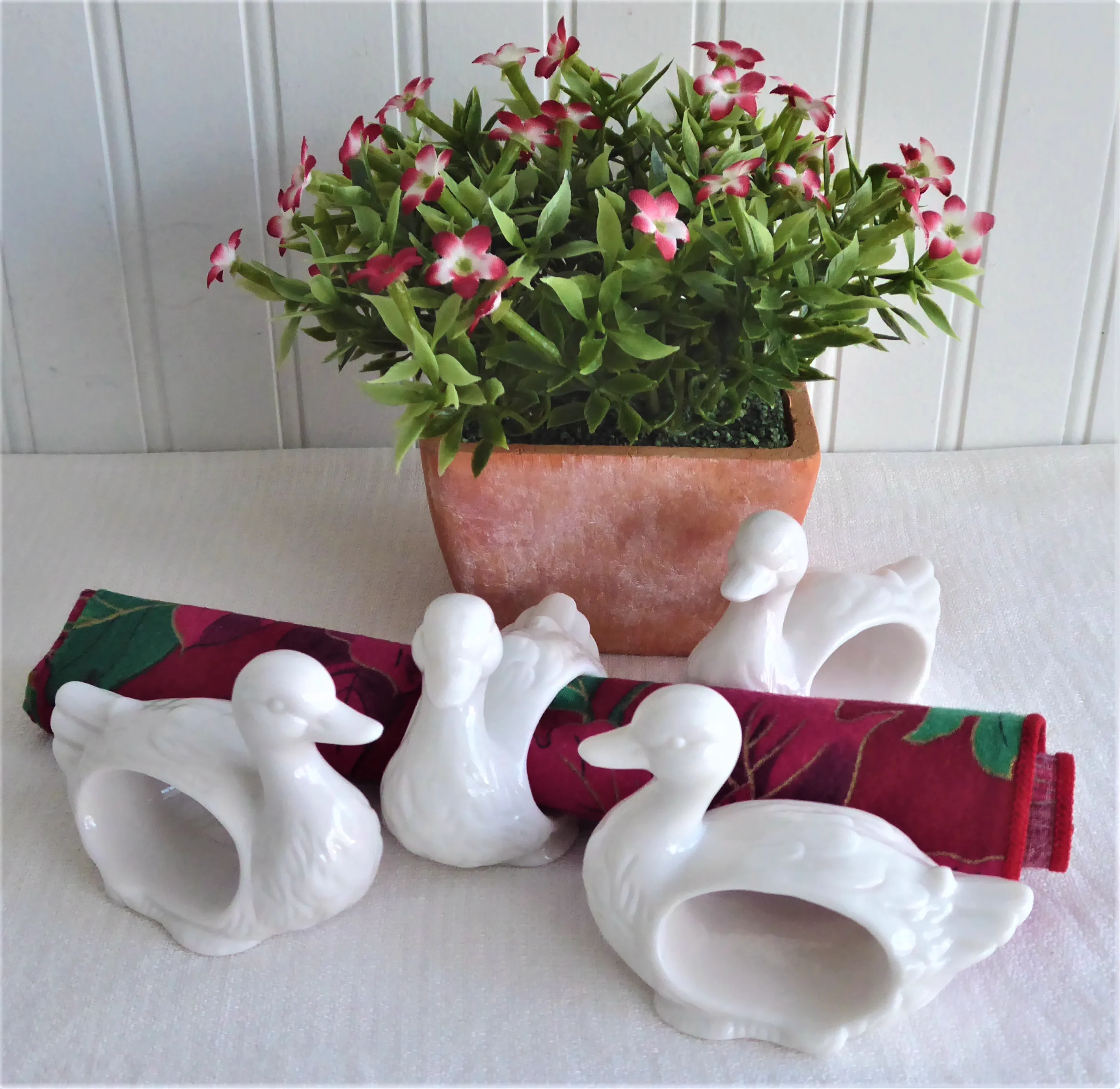 This is a cute flock of 4 white figural porcelain duck or goose napkin rings from the 1990s.