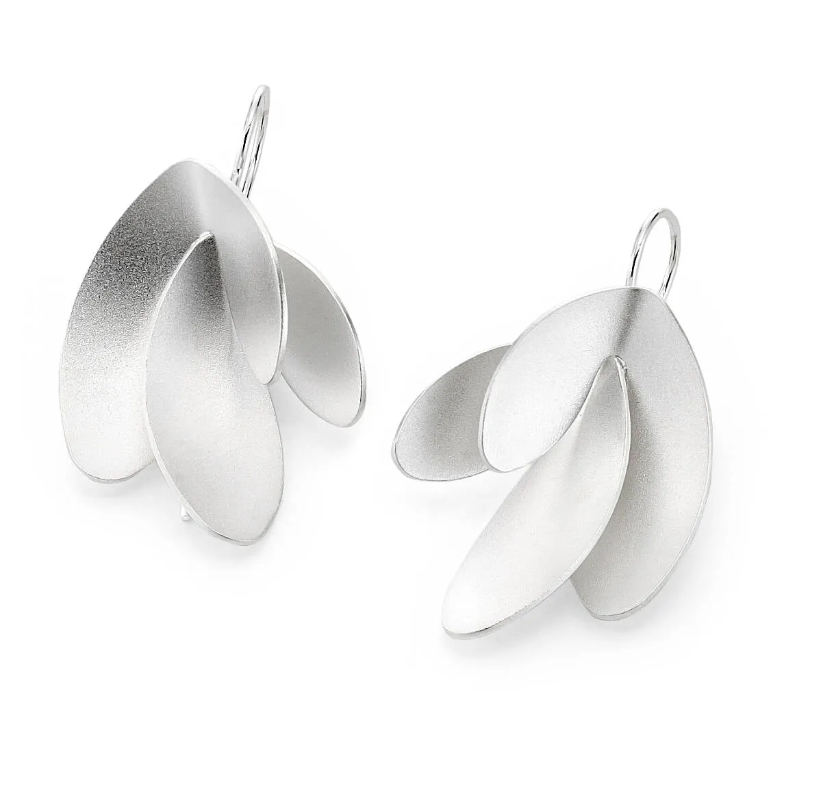 These modern, clean Line sterling silver earrings from Kelim Jewelry are inspired by MAPLE SEED. White matted sterling silver earrings are 1.73" long (44 mm ), including wire. The modern feminine design has a very nice swing when wearing.