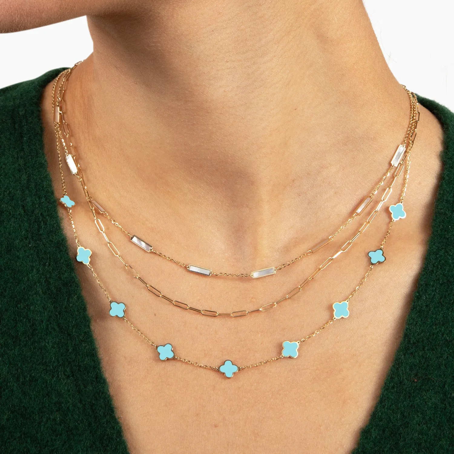 The clover necklace is our go-to piece to add to?any look! Available in?three sizes?and tons of?gemstone?options. Dress it up with a cocktail dress & heels, or dress it down with your comfiest loungewear. Either way, you'll be classic chic!