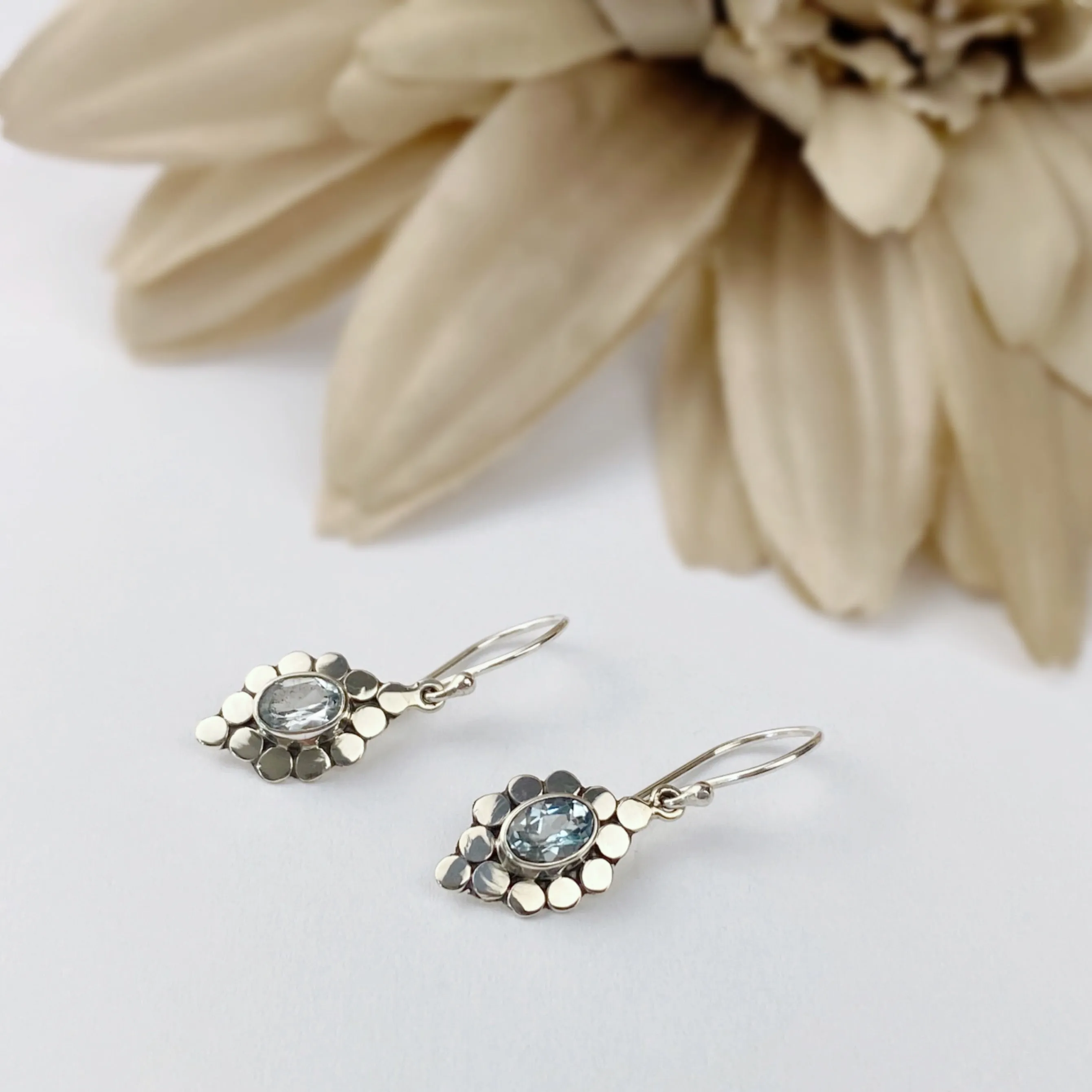 These feminine florals are certain to become a favourite. Wear these pretty drop earrings with handcrafted Silver settings and set with a central stone of faceted Blue Topaz and wait for the compliments...