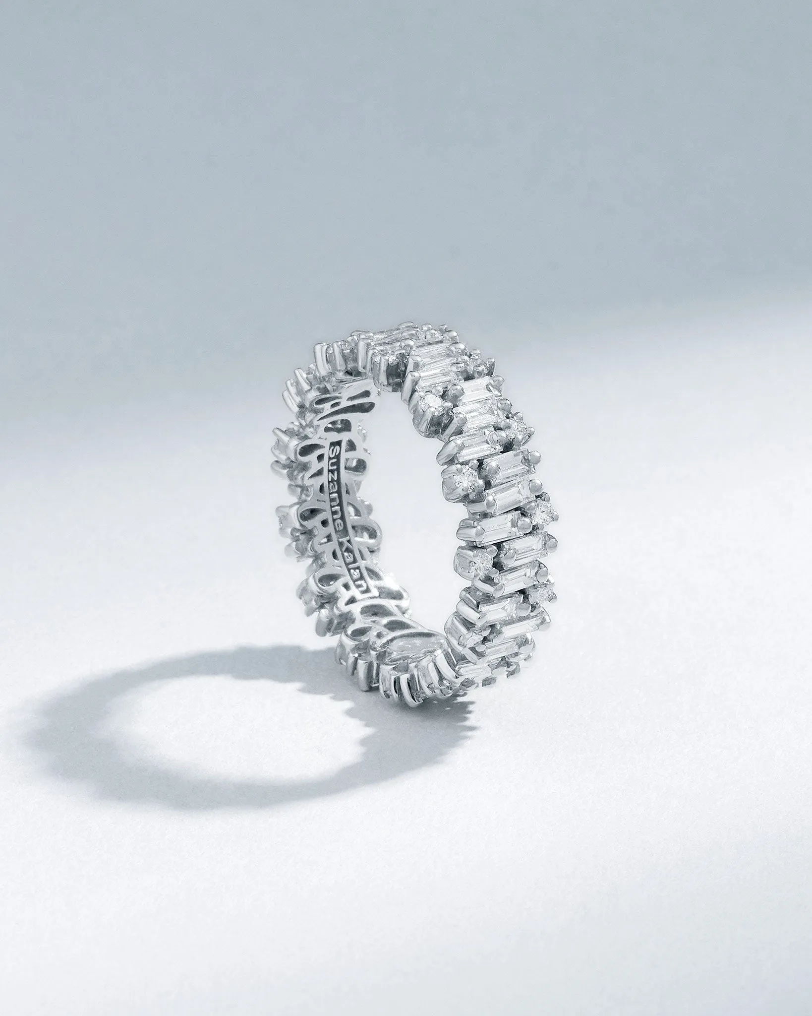 This exquisite ring beautifully blends baguette and round white diamonds. Crafted in 18-karat gold, this ring offers a contemporary twist on the timeless diamond eternity band.