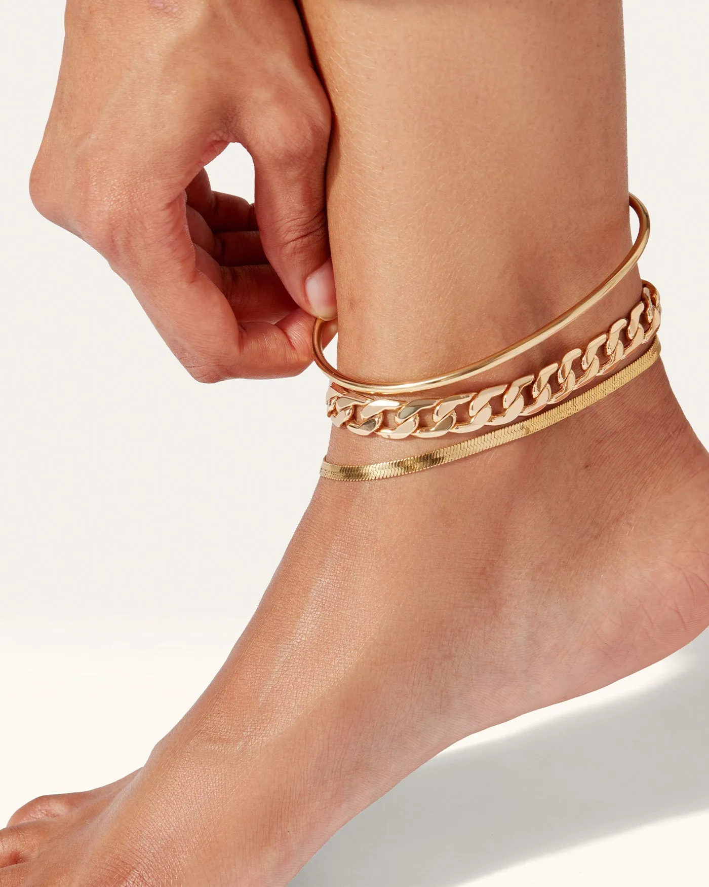 Build a bold anklet stack by pairing minimalist Dane, chunky Henry and slinky Zeina. Finished in high-polish gold. Note: Please indicate your preferred size in Dane.