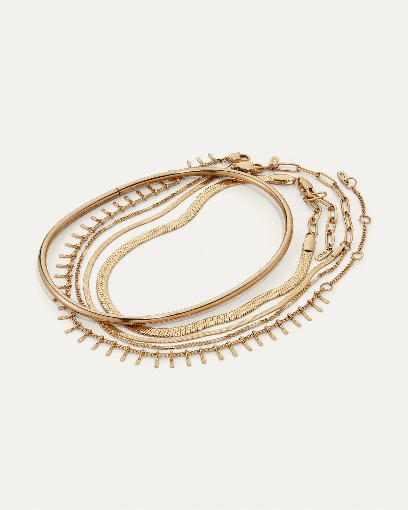 Build a statement anklet stack (that gives the appearance of 5 anklets) with this 5 Star assortment. Pair layered Surfside with light-catching Lumi, slinky Zeina and minimalist Dane. The Statement Stack is water-durable so you can wear it with ease in water. Finished in high-polish gold. Note: Please indicate your preferred size in Dane.